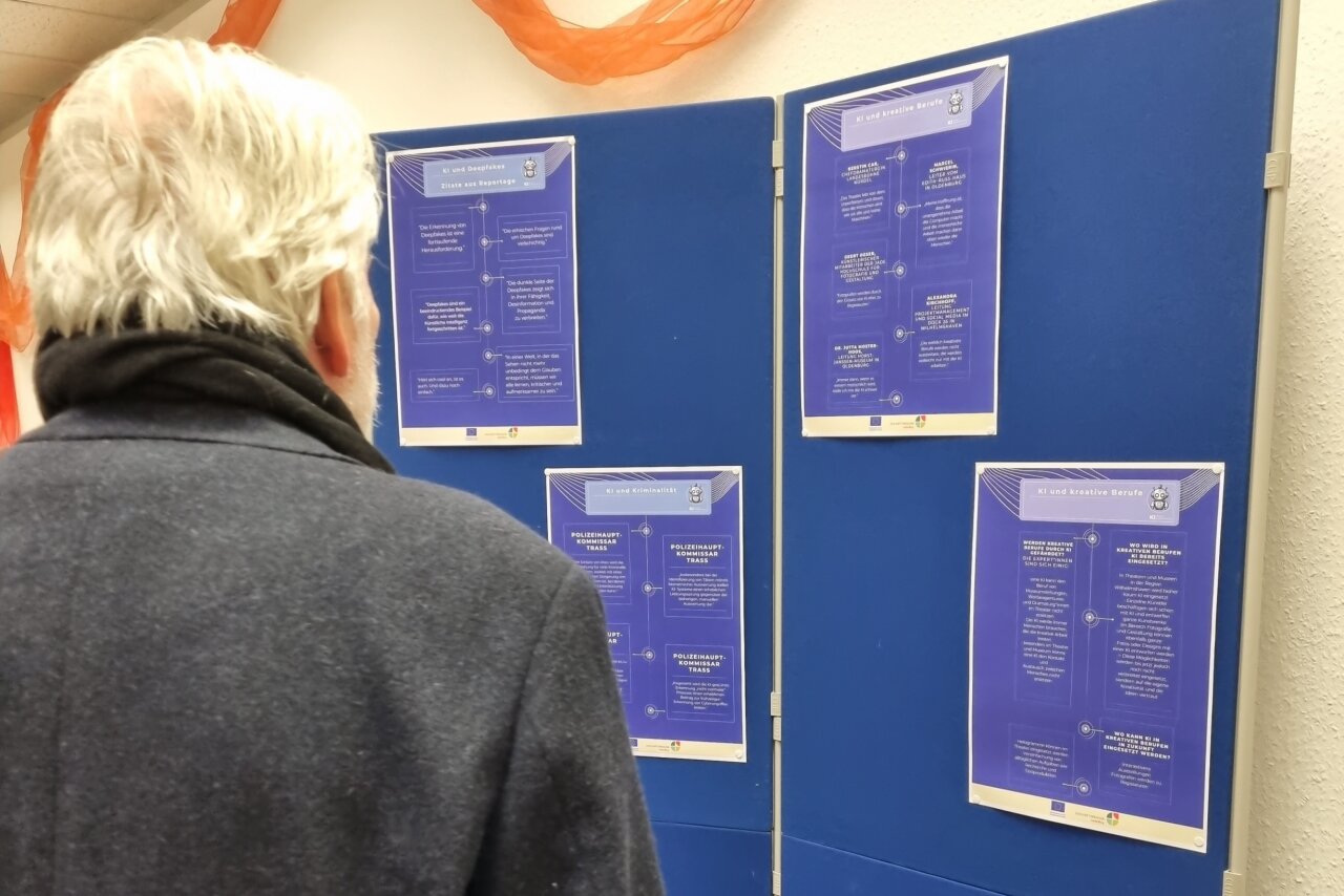 Ziel der Studierenden war es, in ihrem Medienprojekt das Thema KI überhaupt greifbarer zu machen. Dafür haben sie am 14. Dezember all ihre Ergebnisse präsentiert. Und so haben sie sich vor Ort auf Recherche begeben. Sie haben mit der Chefdramaturgin der Landesbühne gesprochen, mit Schüler*innen und Lehrer*innen der IGS, und mit Wissenschaftler*innen die Grenzen von KI in Hinblick auf Deepfakes und Demokratie ausgelotet. Marcel Schwierin, Leiter des Edith-Russ-Hauses in Oldenburg, hat die Studierenden durch eine Ausstellung, die KI generiert ist, geführt. Seine Prognose: „Das Unangenehme übernimmt für uns immer mehr die KI, aber das Schöne und Kreative wird bei dem Menschen bleiben.“