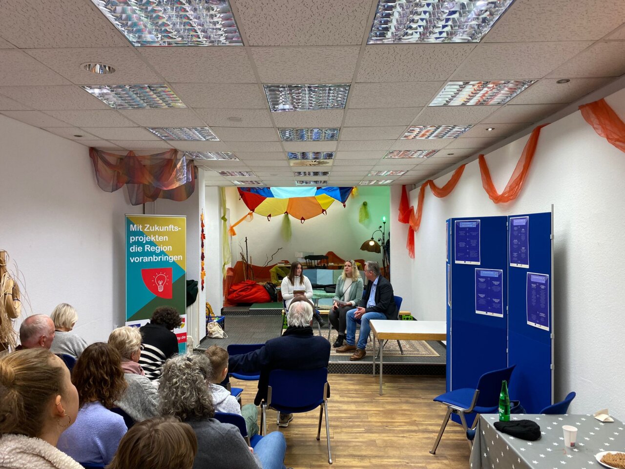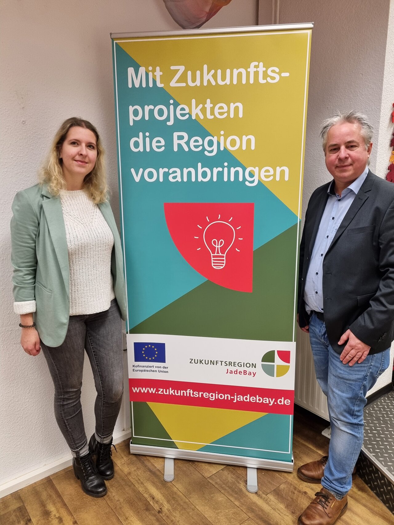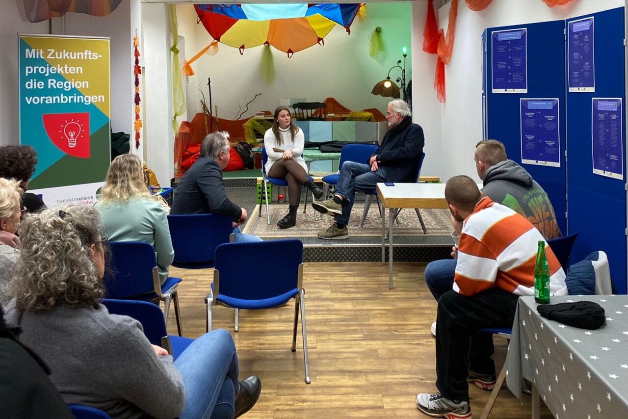 Projektpartner des Medienprojekts ist die Zukunftsregion JadeBay. Auf der improvisierten Speaker*innenbühne, wo früher Haare geschnitten wurden, haben Eva Forkel und Olaf Goldbaum am Donnerstag die Bühne eröffnet und ihr Projekt vorgestellt: „Wir möchten dazu beitragen, dass sich die Region weiterentwickelt und wir zusammen an unseren Zukunftskompetenzen arbeiten“, so die beiden, die gerade durch viele Schulen und Institutionen unterwegs sind. Es geht darum „Berührungsängste abzubauen, sich mit neuen Technologien auseinanderzusetzen und zukunftsfähig zu sein“, so das JadeBay Team. „Vielleicht ist es gerade auch in Hinblick auf unsere ganz persönlichen Lebenswelten gar nicht so kompliziert, wie viele denken“, so Forkel, „einfach anfangen und ausprobieren“. Die Fördergelder der Zukunftsregion sind da, die beiden hoffen jetzt auf Ideen und Projektanträge. „Vielleicht können wir bald schon in einem Digitalen Innovationszentrum den nächsten KI-Schnack machen“, so Goldbaum.